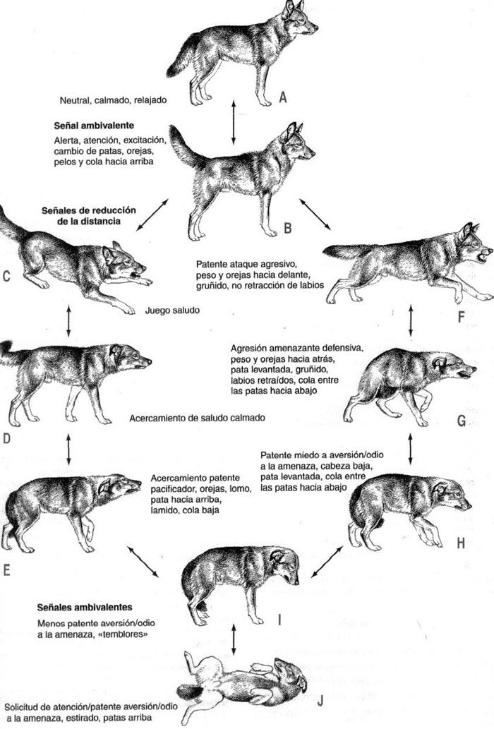 Con un perro desconocido, del que desconfía, la cola se menea de izquierda a derecha, escorándose el movimiento a la izquierda.